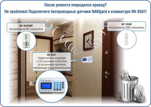 Если во время ремонта были повреждены провода, которые подсоединяли основное оборудование к электросети, то не стоит расстраиваться. Благодаря беспроводным ИК и СМК извещателям, а также графической LCD клавиатуре, делать повторную прокладку проводов не нужно. Это оборудование буде представлено на выставке Moscow Securika 19 марта, и вы сможете оценить его преимущества.
